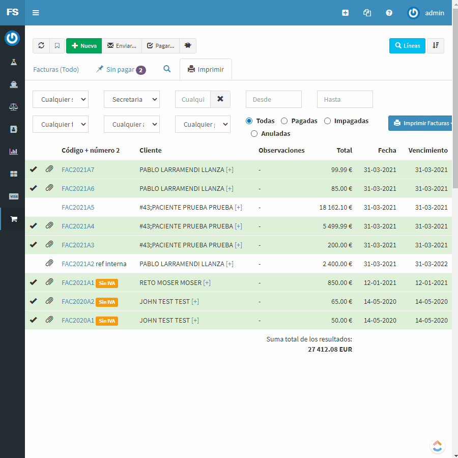 Accediendo al menú "Facturación", encontramos un listado de las visitas realizadas pendientes de facturar. Podremos: